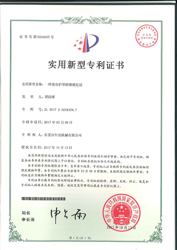 一种设有护罩的锁模近(jìn)接专(zhuān)利证书